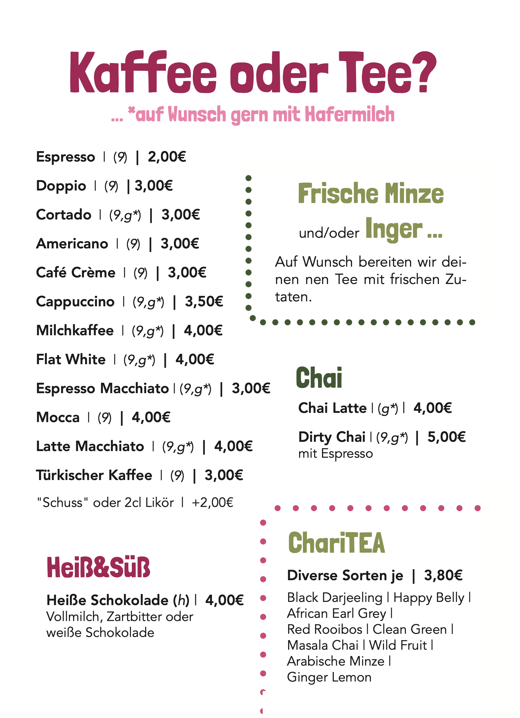 Bier, Wein, Kuchen, Imbiss-Snacks, Schokolade,... und ganz besondere Tee- und Kaffee-Spezialitäten (aus der italienischen Siebträgermaschine) gehen extra. Aber natürlich kannst Du auch das alles ins ganze Haus mitnehmen und da genießen, wo Du gerade sein willst.