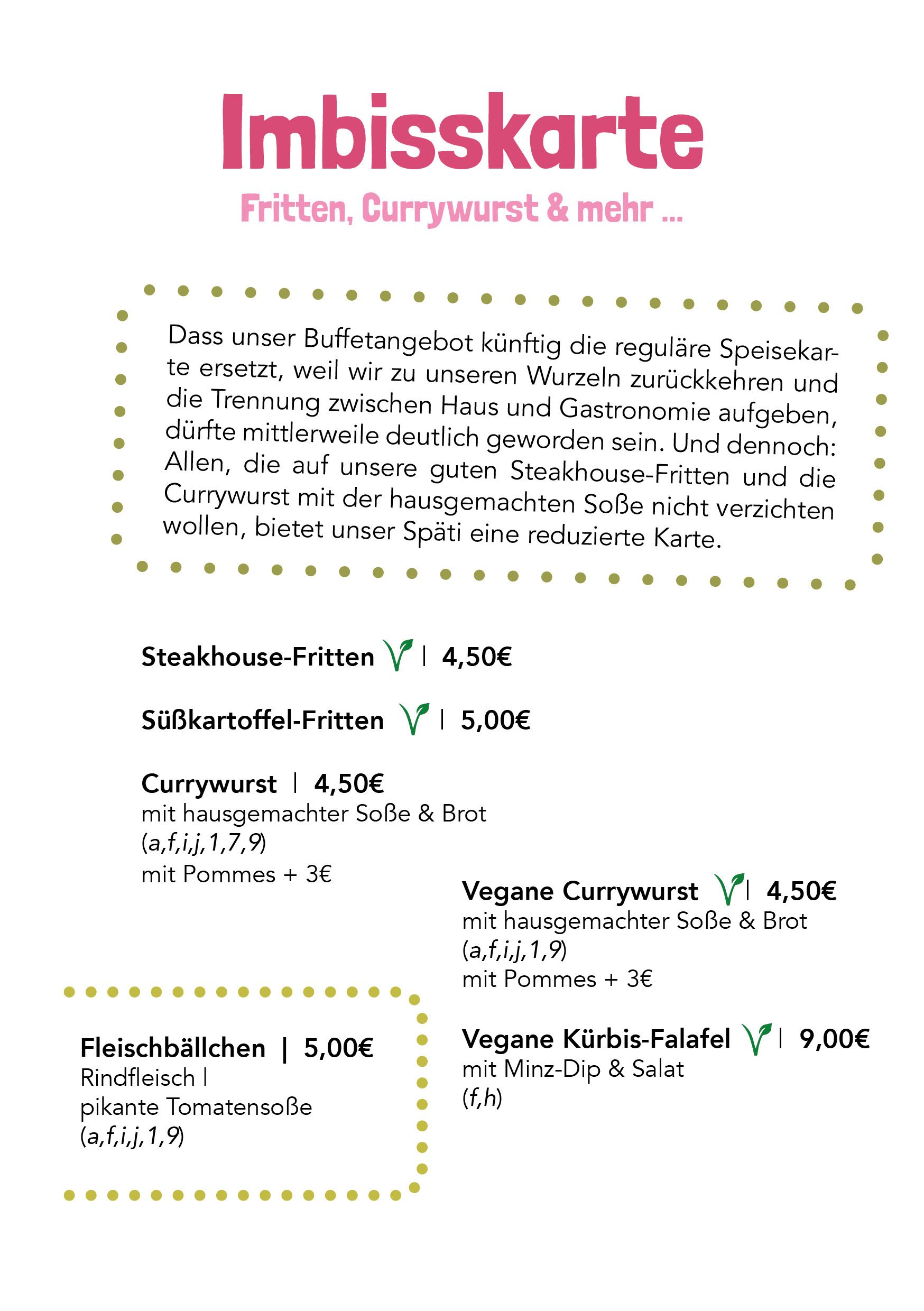 - Salatbuffet, Brotzeit, Wurst, Käse und Suppe gibt's immer, und von 12 - 14:30 sowie von 18 - 21 kommen warme Speisen hinzu.