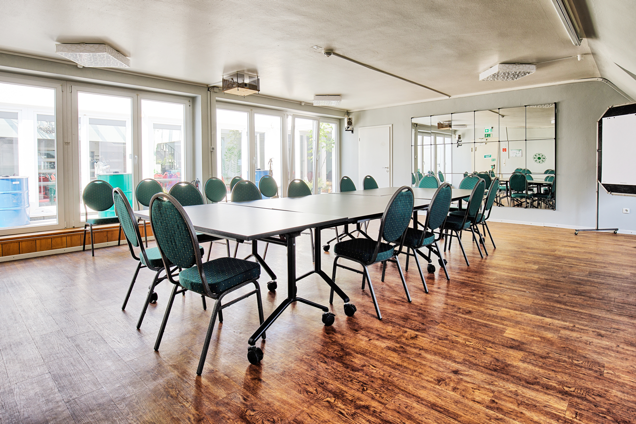 At Unperfekthaus, almost all rooms have natural light, access to a balcony or roof terrace, a flipchart, a moderator's wall, and a large screen or projector. There's a stage with lighting and sound, and fantastic buffets are available upon request, or you can use the buffet already provided on the ground floor. As long as you're okay with others joining you, use of the room is included in the admission price. This is ideal for musicians who want to make themselves known or initiatives that welcome new members to their meetings.