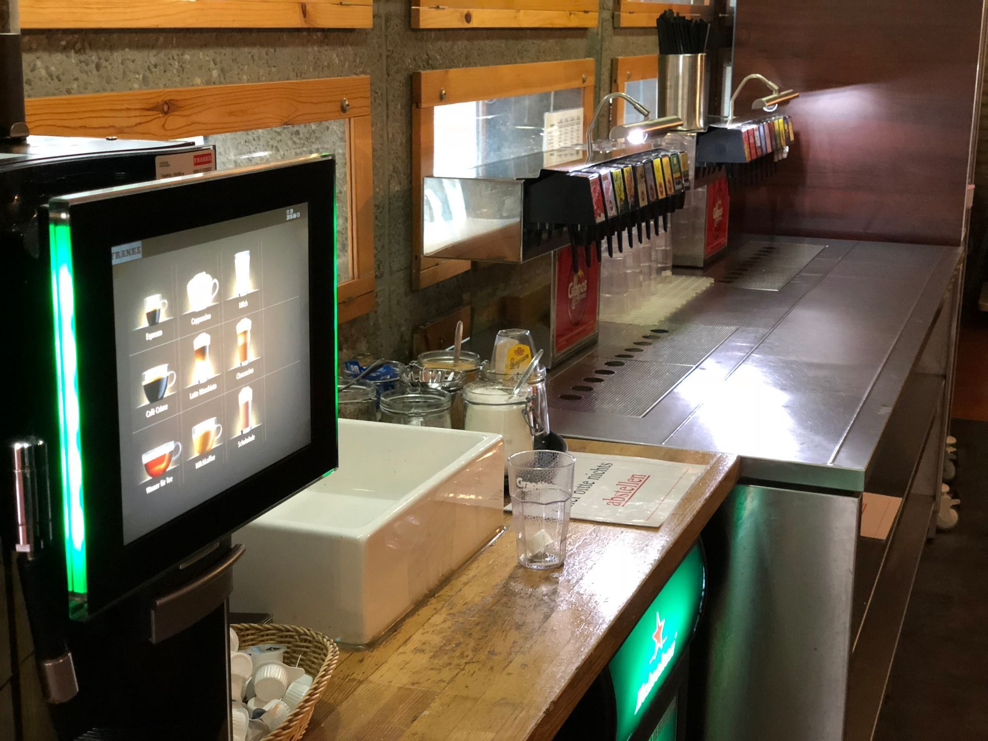 An allen Bildschirmen und Beamern hängen HDMI-Kabel zum Anschluss Deines Notebooks (oder nutze Airplay oder Cromecast). Fernbedienung hängt daneben bzw. bekommst Du unten an der Theke. Auch Musikinstrumente frei nutzbar. Beliebig viel Cappuccino, Espresso, Milchkaffee, Kakao, Tee sowie über 10 Sorten von Softdrinks inklusive an den Getränkestationen für alle.